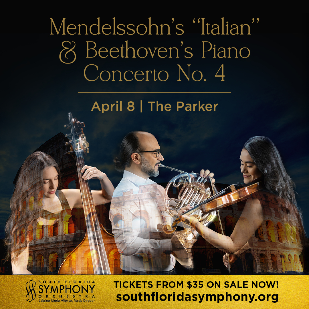 Dark and stormy seas give way to sun-soaked skies during South Florida Symphony Orchestra’s (SFSO) 28th season of “Juxtapositions” closer at 7:30 p.m. on Wednesday, April 8, at The Parker in Fort Lauderdale (707 NE 8th Street). Led by award-winning music director Maestra Sebrina María Alfonso, SFSO presents Mendelssohn’s Hebrides Overture “Fingal’s Cave” which conjures the misty and mystic beauty of Scotland’s famed Isle of Staffa, and his Symphony No. 4, nicknamed the “Italian,” recalling the country’s natural beauty, radiating warmth and energy. Rounding out the program is Beethoven’s Piano Concerto No. 4, a rich and nuanced affair, featuring acclaimed pianist Tao Lin. Enjoy a pre-concert chat with Dr. Alan Mason 30 minutes before the performance, featuring in-depth conversation and insights about the works and composers.