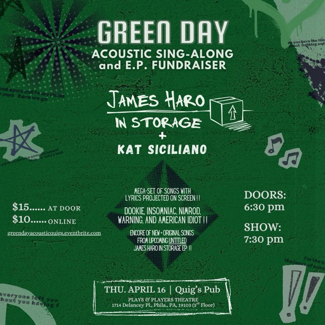 James Haro in Storage will be playing a solo acoustic mega-set of songs with words you can sing along to on a screen!! -- from their albums Dookie - American Idiot!