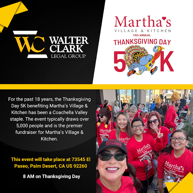 Walter Clark Legal Group is proud to sponsor the 19th Annual Thanksgiving Day 5K benefiting Martha’s Village & Kitchen! This 5K supports Martha’s Village & Kitchen, a local nonprofit organization devoted to serving people experiencing homelessness and providing key services to help them out of poverty. This Thanksgiving, we invite you to participate, donate or just show up to cheer on those supporting this great cause. For more information, please visit our event page.