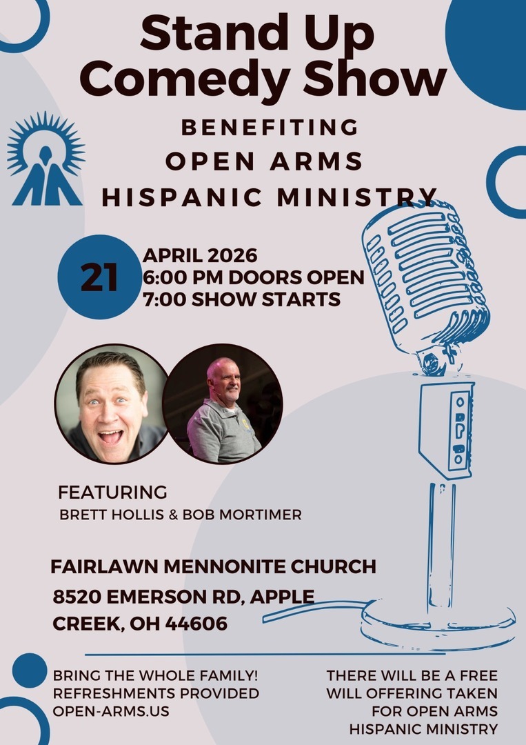 Join us for a night of laughter at a stand-up comedy show benefiting Open Arms Hispanic Ministry on April 21, 2026, at Fairlawn Mennonite Church (8520 Emerson Rd, Apple Creek, OH). Doors open at 6:00 PM, and the show begins at 7:00 PM. Featuring comedians Brett Hollis and Bob Mortimer, this family-friendly event includes refreshments and a freewill offering to support outreach to the local Hispanic community. Learn more at open-arms.us.Open Arms Hispanic Ministry serves the local Hispanic community through outreach, support, and Christ-centered ministry. This event is an opportunity to enjoy a great night out while helping further that mission.
