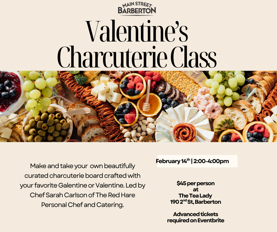 HomeEventsValentine's Charcuterie Class Valentine's Charcuterie Class Saturday, February 14, 2026 2:00 PM - 4:00 PM 2:00 PM - 4:00 PM See all dates and Times The Tea Lady Inc Parking Deals Get a Ride LYFT UBER Add to Calendar 02/14/2026 02:00 PM 02/14/2026 04:00 PM America/Atikokan Valentine's Charcuterie Class https://www.eventbrite.com/e/valentines-charcuterie-class-tickets-1977523232221?aff=oddtdtcreator Details & Tickets: https://www.upcomingevents.com/akron/events/the-tea-lady-inc/valentines-charcuterie-class-586729?ref=uceaddevent The Tea Lady Inc, 190 2nd St NW, Barberton, OH, 44203-2530 Set Reminder Event Tag Cooking Class, Special Event Categories Holiday https://www.eventbrite.com/e/valentines-charcuterie-class-tickets-1977523232221?aff=oddtdtcreator Read More View Less