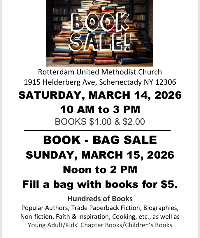 HomeEventsBOOK SALE - Rotterdam United Methodist Church BOOK SALE - Rotterdam United Methodist Church Saturday, March 14, 2026 10:00 AM - 3:00 PM 10:00 AM - 3:00 PM See all dates and Times 1915 Helderberg Ave Parking Deals Get a Ride LYFT UBER Add to Calendar 03/14/2026 10:00 AM 03/14/2026 03:00 PM America/Atikokan BOOK SALE - Rotterdam United Methodist Church Book Sale - Hundreds of books, all genres. All novels $2. All other books $1. Details & Tickets: https://www.upcomingevents.com/albany/events/1915-helderberg-ave/book-sale-rotterdam-united-methodist-church-584242?ref=uceaddevent 1915 Helderberg Ave, 1915 Helderberg Avenue, Rotterdam, NY, 12306 Set Reminder Categories Charities, Good For Families, Kids & Family, Neighborhood Book Sale - Hundreds of books, all genres. All novels $2. All other books $1.