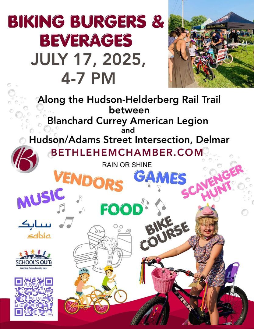 Join the Bethlehem Chamber of Commerce on Thursday, July 17th from 4–7 PM for a fun-filled, family-friendly event along the Albany County Helderberg-Hudson Rail Trail in Delmar—rain or shine! Now in its third year, this free community celebration features live music by DJ Nate Derucher, a kid-friendly scavenger hunt, games, food trucks, face painting, local vendors, and art displays by Art on the Rail Trail and the Mohawk-Hudson Land Conservancy. Walk or ride the trail (no motorized bikes/scooters allowed) and bring cash or cards to shop from local artisans or grab a craft beer or bite to eat.