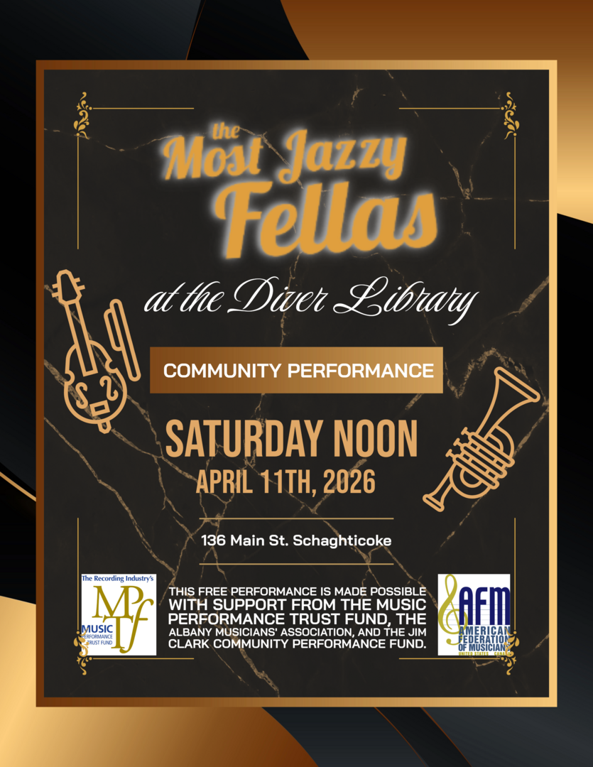The Most Jazzy Fellas return to the historic Arvilla E. Diver Memorial Library in Schaghticoke, NY for a noontime concert you won't want to miss. The quartet brings a set of standards, surprises, and tongue-in-cheek jazzy fun, with support from the Music Performance Trust Fund and the American Federation of Musicians Local 14.