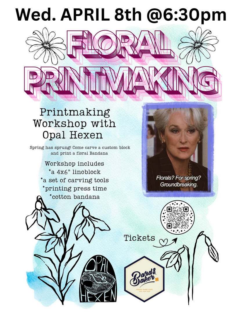 Opal Hexen is a local printmaker and artist in Troy, who's work can be found at Nerdy By Nature, and vending at local markets like the Troy Farmers Market, Big Gay Markets, and Upstate Punkrock Flea Markets!