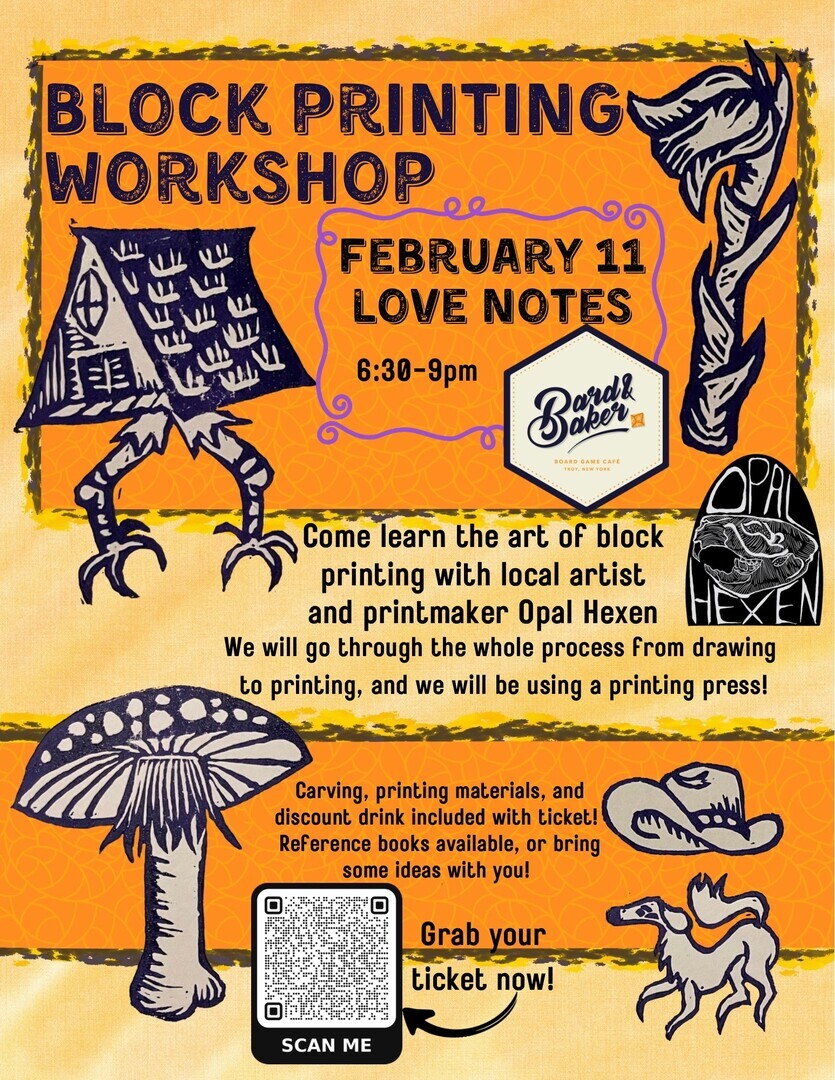 Come learn the art of block printing with local artist and printmaker Opal Hexen! All carving and printing materials are included.