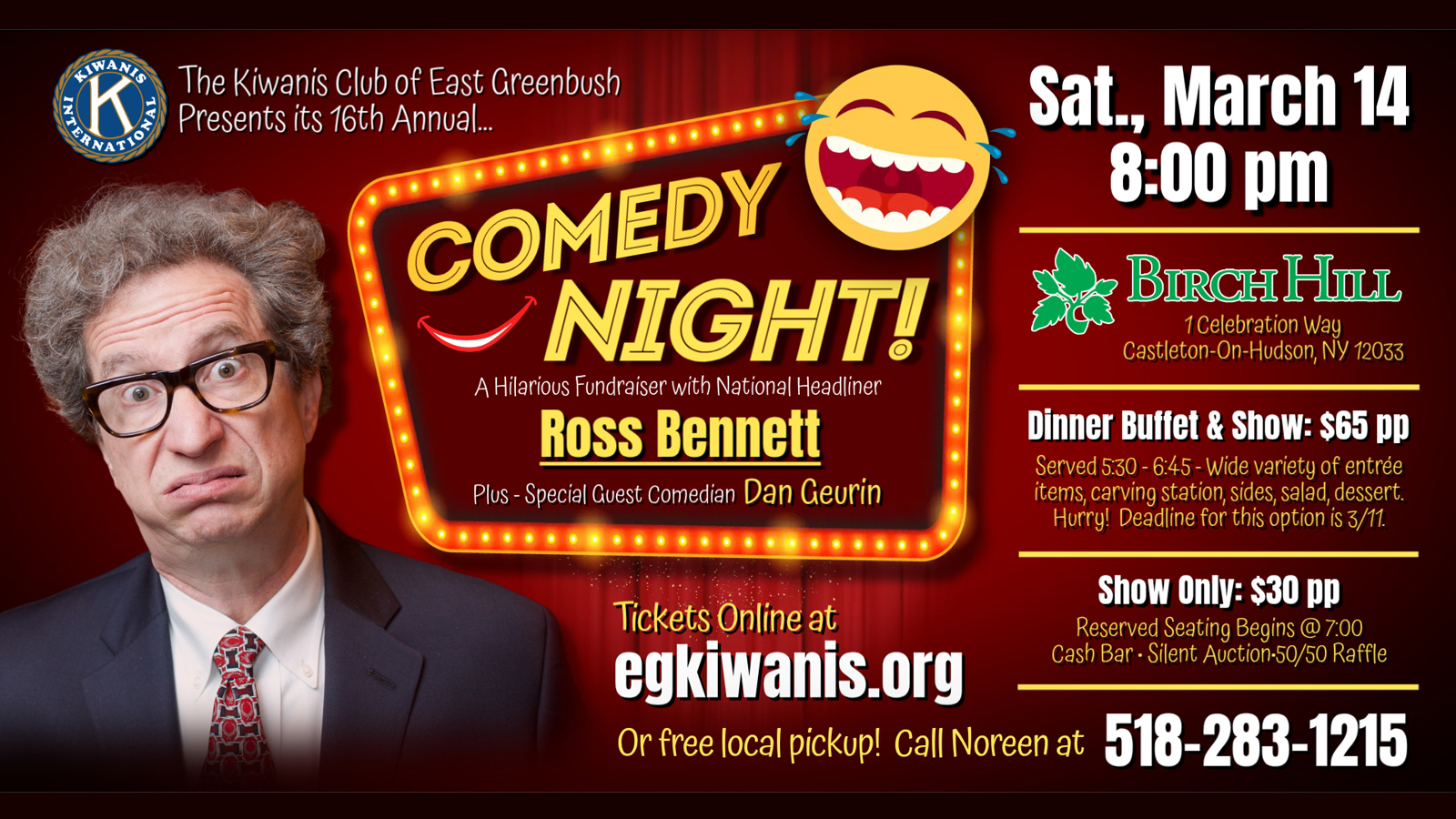 The Kiwanis Club of East Greenbush proudly presents its 16th Annual Comedy Night Fundraiser at beautiful Birch Hill in Castleton, NY.
