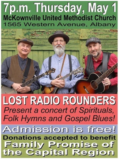 Masters of acoustic Americana, Lost Radio Rounders will present classic spirituals, street corner gospel blues and front porch folk hymns, 7:00 pm Thursday, May 1, 2025 in the Old Chapel of McKownville United Methodist Church 1565 Western Avenue, Albany, New York.
