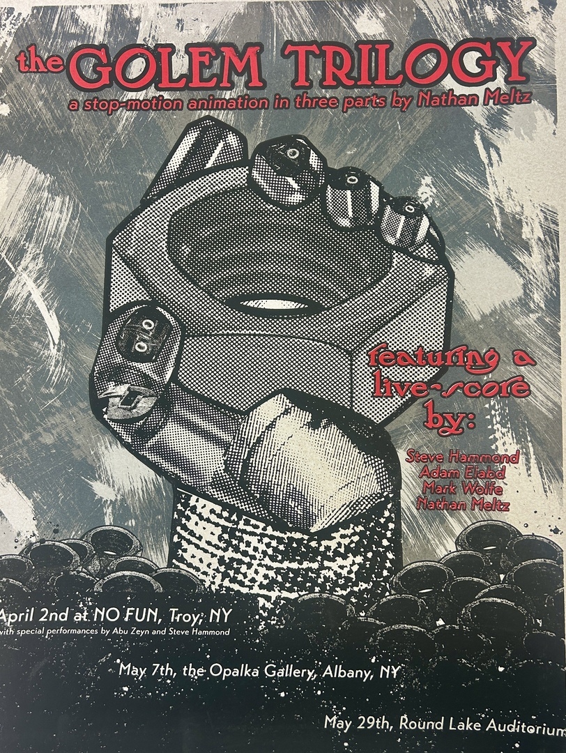 The Golem Trilogy, a stop-motion animation in three parts by Nathan Meltz, featuring live score by Steve Hammond, Adam Elabd, Mark Wolfe, and Nathan Meltz