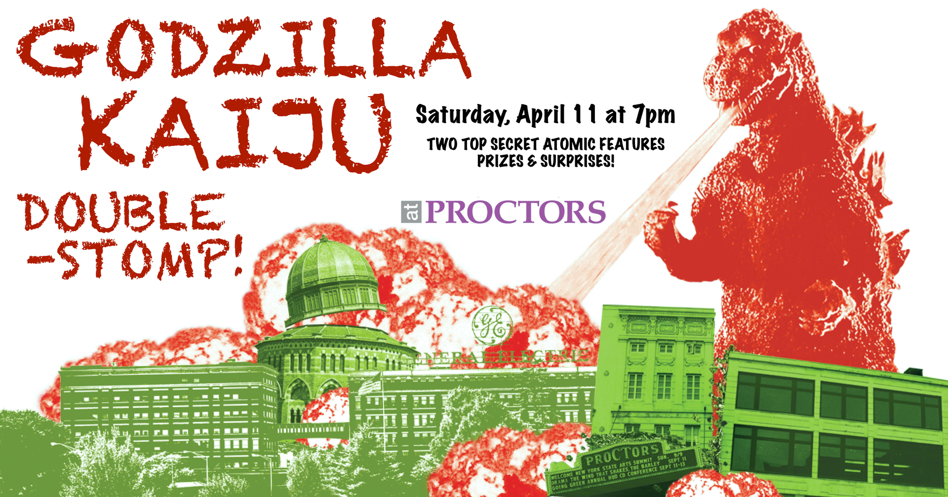 Godzilla returns to Proctors for another roarin’ rampage! We will not be announcing the titles of the two movies until they burst onto the screen, but – as usual – the first of the two will be presented in English for the benefit of our younger fans, while the second will be in Japanese with English subtitles. Fans of all ages are encouraged to dress up as their favorite kaiju or tokasatsu hero. And be sure to practice your roars! Scott, from Hilltown Kaiju, will join us again this year in our lobby before the first film with his incredible display of kaiju figures and memorabilia. All content rated PG, and the event runtime is expected to be approx. 200 minutes, including a 10-15 minute intermission.