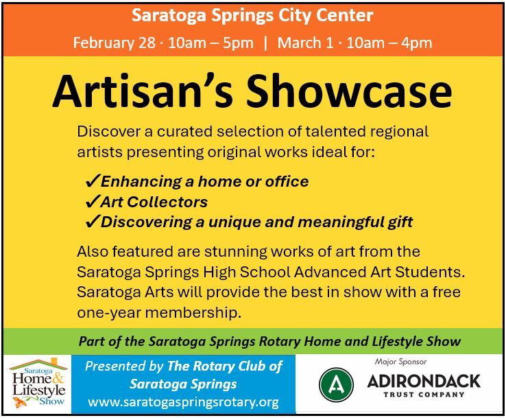 The showcase features a curated selection of talented artists presenting original works ideal for enhancing a home or office, for art collectors or for discovering a unique and meaningful gift. The Artisans Showcase also features amazing works of art from the Saratoga Springs High School Advanced Art Students. These talented students are juried by Saratoga Arts and the best in show wins a free one-year membership.