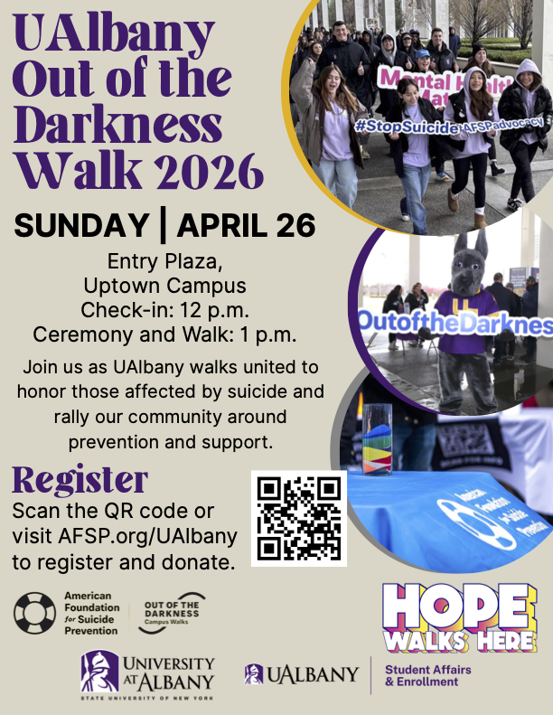 The American Foundation for Suicide Prevention's (AFSP) signature student fundraising series. Help us make mental health and suicide prevention a national priority. The Out of the Darkness Walks are about raising crucial funds and creating a safe space for those impacted by suicide. Visit vendor booths, pick-up beads at the honor bead tent, take photos with our props, and more! At the event there will be an area to share messages of hope and remembrance.
