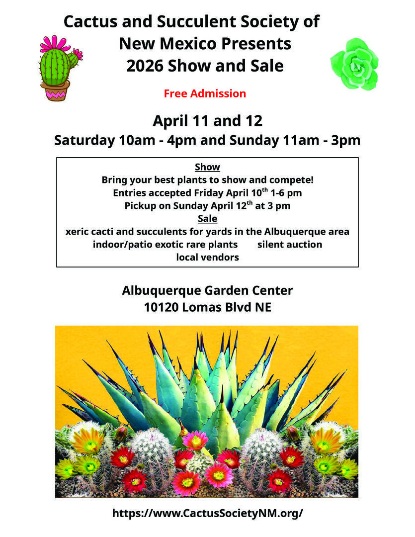 The Show and Sale will be held at the Albuquerque Garden Center at 10120 Lomas Blvd., NE We are open from 10 am until 4 pm on Saturday and 11 am to 3 pm on Sunday. There is no admission charge. The show will display several hundred plants, including some of the finest specimens from many different private collections in our region, including our society's members. In addition to the judged show, the society's annual sale brings in vendors, from various places that provide a wide variety of cacti and other succulent plants available for purchase; they range from bargain starter plants to spectacular specimens. Further information about the Cactus & Succulent Society of New Mexico may be found at https://www.CactusSocietyNM.org.