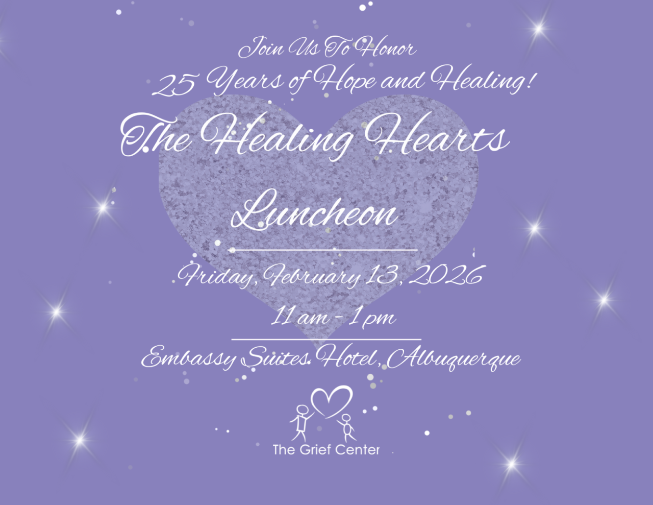 Join us for a heartfelt afternoon at the 20th Annual Healing Hearts Luncheon on February 13, from 11:00 AM to 1:00 PM, at the beautiful Embassy Suites by Hilton Albuquerque.