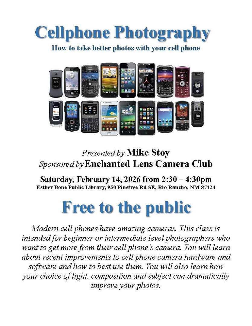 Modern cell phones have amazing cameras. This class is intended for beginner or intermediate level photographers who want to get more from their cell phone’s camera. You will learn about recent improvements to cell phone camera hardware and software and how to best use them. You will also learn how your choice of light, composition and subject can dramatically improve your photos.