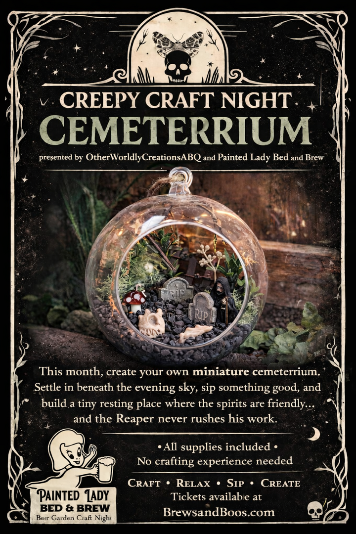 With the weather turning warm, we’ll gather in the Beer Garden, where lantern light flickers, drinks flow, and creativity rises like mist over an old graveyard. This month, create your own miniature cemeterrium, complete with tiny tombstones, winding paths, and perhaps a watchful Grim Reaper standing guard among the graves.