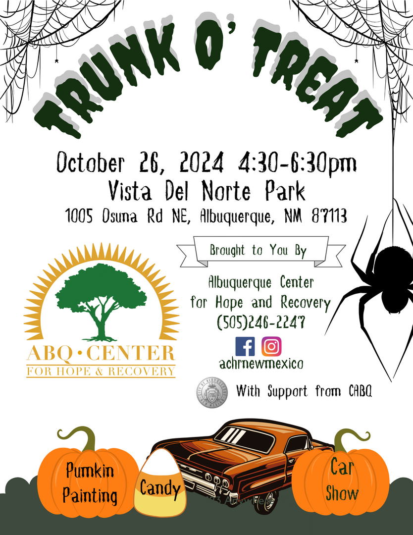 Join the Albuquerque Center for Hope and Recovery in our Halloween celebration with Trunk O' Treat! We will have candy, pumpkin painting, and a low rider car show. All are welcome!