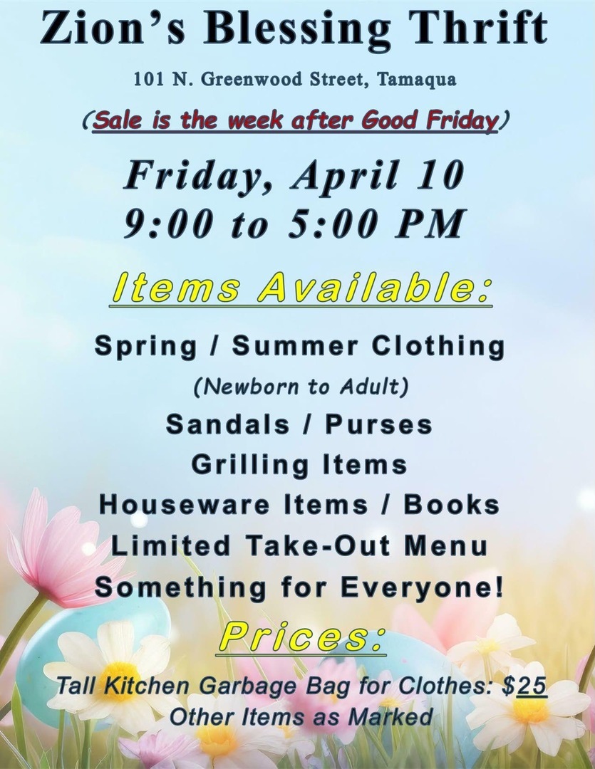 HomeEventsZion’s Blessing Thrift Store Zion’s Blessing Thrift Store Friday, April 10, 2026 9:00 AM - 5:00 PM 9:00 AM - 5:00 PM See all dates and Times 101 N Greenwood St Parking Deals Get a Ride LYFT UBER Add to Calendar 04/10/2026 09:00 AM 04/10/2026 05:00 PM America/Anguilla Zion’s Blessing Thrift Store Prices® Tall Kitchen Garbage Bag for Clothes: $25 Other Items as MarkedEvent LinksWebsite: https://go.evvnt.com/3565407-0 Details & Tickets: https://www.upcomingevents.com/allentown/events/101-n-greenwood-st/zions-blessing-thrift-store-631987?ref=uceaddevent 101 N Greenwood St, 101 North Greenwood Street, Tamaqua, PA, 18252 Set Reminder Categories Benefits Charity, Fundraising & Charity, Neighborhood, Politics & Activism Neighborhoods Briar Creek (Berwick)Foundryville (Berwick)Breinigsville (Upper Macungie)East Berwick (Berwick) View Event Website » Prices® Tall Kitchen Garbage Bag for Clothes: $25 Other Items as MarkedEvent LinksWebsite: https://go.evvnt.com/3565407-0