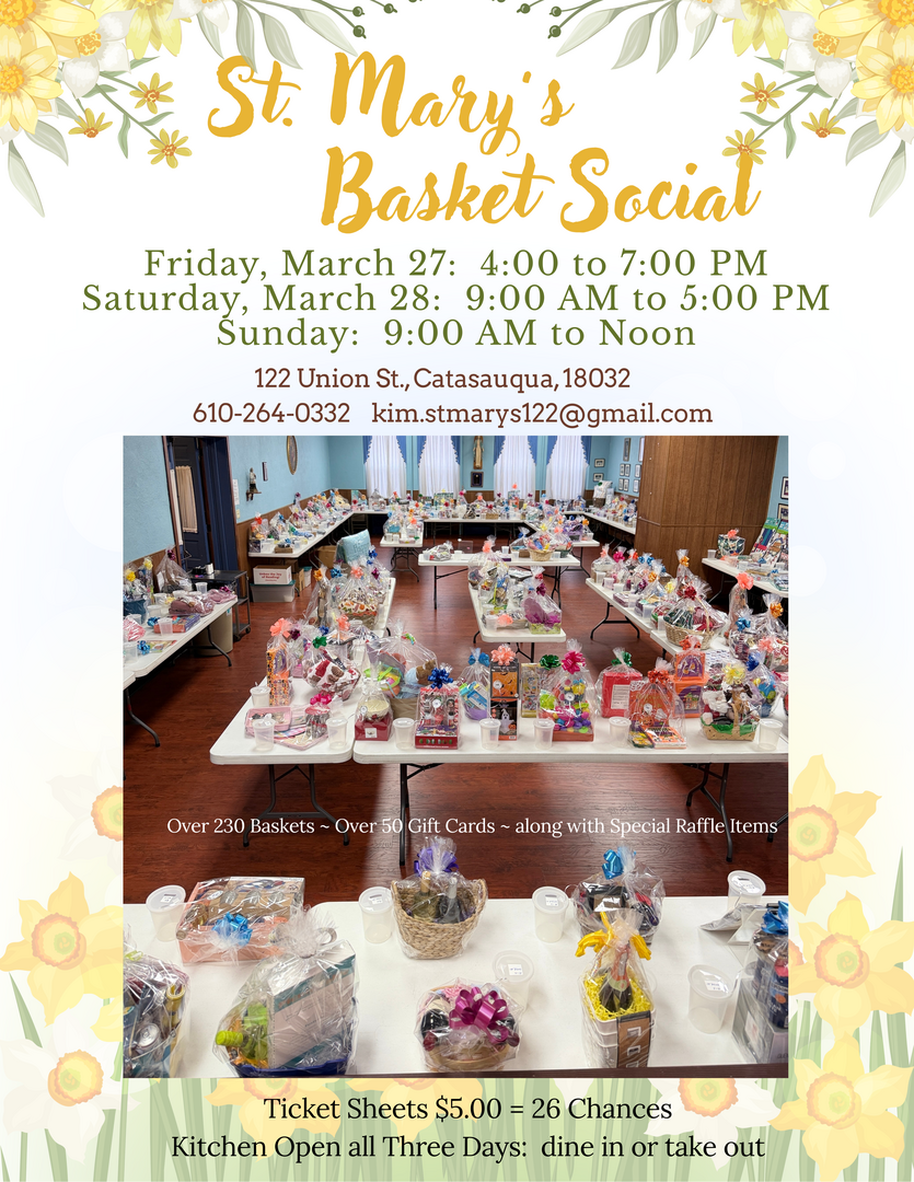 Our Basket Social/Tricky Tray is held in our Parish Center. Tickets are $5.00 for a sheet of 26 chances. Baskets for all ages. Kitchen open for dine-in or take and Bake Sale.