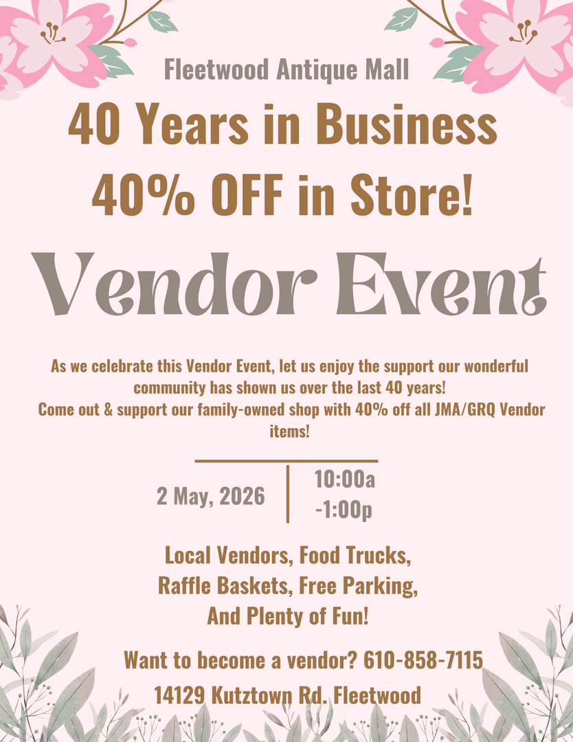 HomeEvents40th Business Anniversary Vendor Event 40th Business Anniversary Vendor Event Saturday, May 02, 2026 10:00 AM - 1:00 PM 10:00 AM - 1:00 PM See all dates and Times 14129 Kutztown Rd Parking Deals Get a Ride LYFT UBER Add to Calendar 05/02/2026 10:00 AM 05/02/2026 01:00 PM America/Anguilla 40th Business Anniversary Vendor Event 40th Small Business Anniversary with 40% off in store! Local vendors & Food Trucks Raffle Baskets & More!Event LinksFacebook: https://go.evvnt.com/3536033-0 Details & Tickets: https://www.upcomingevents.com/allentown/events/14129-kutztown-rd/40th-business-anniversary-vendor-event-621680?ref=uceaddevent 14129 Kutztown Rd, 14129 Kutztown Road, Fleetwood, PA, 19522 Set Reminder Categories Holiday, Sales & Retail, Shopping 40th Small Business Anniversary with 40% off in store! Local vendors & Food Trucks Raffle Baskets & More!Event LinksFacebook: https://go.evvnt.com/3536033-0 Read More View Less