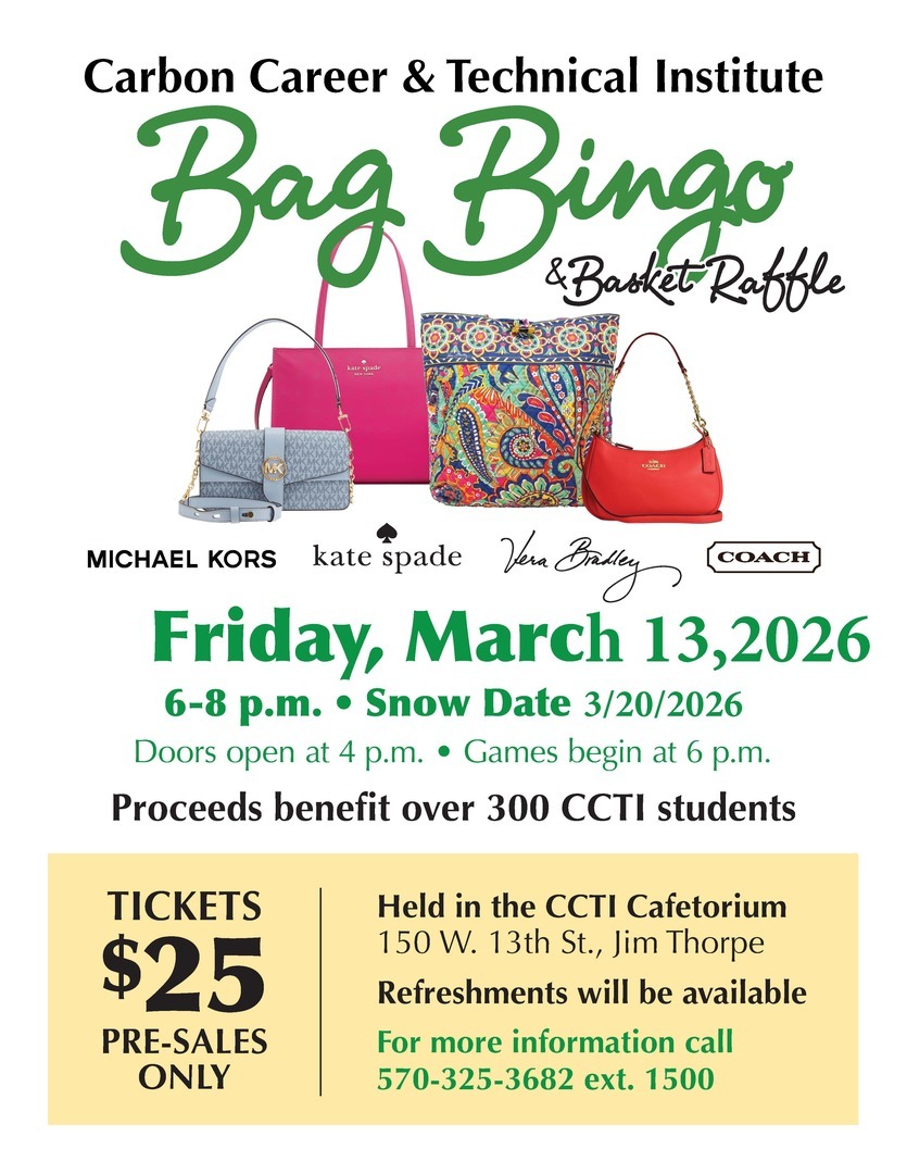 CCTI Designer Purse bingo benefits over 300 Career & Technical High School students serving the Carbon county area. Proceeds from this fundraiser are used to offset costs for student competitions in Skills USA, DECA and HOSA as well as other student programs.