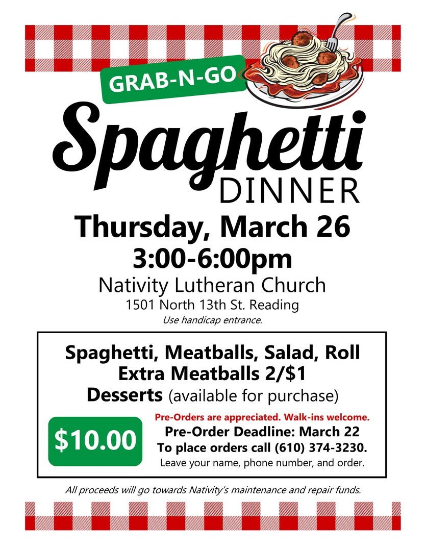 Our Grab-n-Go Spaghetti Dinner is coming up! Let us take care of dinner on Thursday, March 26, 3-6p.m.ππ Pre-orders are appreciated. Walk-ins welcome!!! $10 includes spaghetti, meatballs, salad, and roll. Extra meatballs 2/$1. Desserts will also be available for purchase.