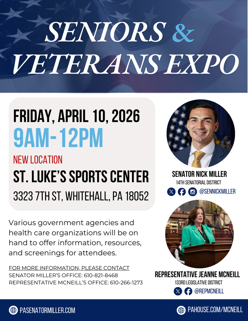 Join Senator Miller and Representative McNeill for their free 2026 Seniors and Veterans Expo on April 10, 2026, from 9am-12pm at St Luke’s Sports Center, 3323 7th St, Whitehall, PA 18052.