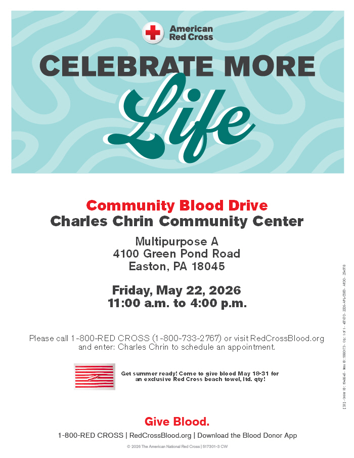 HomeEventsCharles Chrin Community Center Community Blood Drive Charles Chrin Community Center Community Blood Drive Friday, May 22, 2026 11:00 AM - 4:00 PM 11:00 AM - 4:00 PM See all dates and Times 4100 Green Pond Rd Parking Deals Get a Ride LYFT UBER Add to Calendar 05/22/2026 11:00 AM 05/22/2026 04:00 PM America/Anguilla Charles Chrin Community Center Community Blood Drive Open to public. Walk in donors welcome. Come to give blood May 18-31 for an exclusive Red Cross beach towel, ltd. qty!Event LinksWebsite: https://go.evvnt.com/3581979-0 Details & Tickets: https://www.upcomingevents.com/allentown/events/4100-green-pond-rd/charles-chrin-community-center-community-blood-drive-637955?ref=uceaddevent 4100 Green Pond Rd, 4100 Green Pond Road, Palmer Township, PA, 18045 Set Reminder Categories Benefits Charity, Charities, Health & Wellness, Neighborhood View Event Website » Open to public. Walk in donors welcome. Come to give blood May 18-31 for an exclusive Red Cross beach towel, ltd. qty!Event LinksWebsite: https://go.evvnt.com/3581979-0 Read More View Less