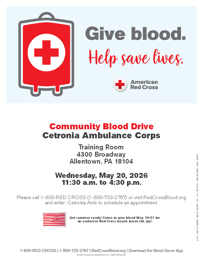 HomeEventsCetronia Ambulance Corps Cetronia Ambulance Corps Wednesday, May 20, 2026 11:30 AM - 4:30 PM 11:30 AM - 4:30 PM See all dates and Times 4300 Broadway Parking Deals Get a Ride LYFT UBER Add to Calendar 05/20/2026 11:30 AM 05/20/2026 04:30 PM America/Anguilla Cetronia Ambulance Corps Open to public, Walk in donors welcome. Come to give blood May 18-31 for an exclusive Red Cross beach towel, ltd. qty!Event LinksWebsite: https://go.evvnt.com/3573582-0 Details & Tickets: https://www.upcomingevents.com/allentown/events/4300-broadway/cetronia-ambulance-corps-635445?ref=uceaddevent 4300 Broadway, 4300 Broadway, Allentown, PA, 18104 Set Reminder Categories Benefits Charity, Charities, Health & Wellness, Neighborhood Neighborhoods Hamilton Park (Allentown)Trexler Park (Allentown)West End (Allentown) View Event Website » Open to public, Walk in donors welcome. Come to give blood May 18-31 for an exclusive Red Cross beach towel, ltd. qty!Event LinksWebsite: https://go.evvnt.com/3573582-0 Read More View Less