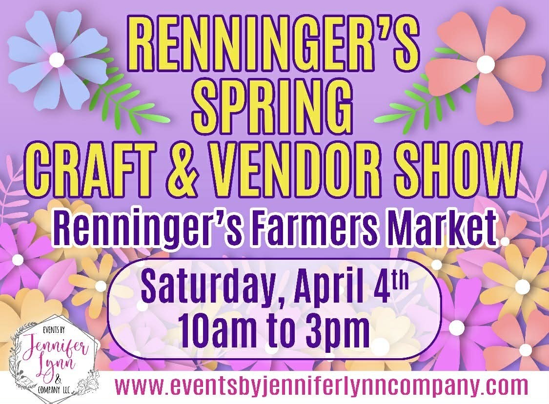 HomeEventsRenninger's Spring Craft & vendor Show Renninger's Spring Craft & vendor Show Saturday, April 04, 2026 10:00 AM - 3:00 PM 10:00 AM - 3:00 PM See all dates and Times 450 Noble St Parking Deals Get a Ride LYFT UBER Add to Calendar 04/04/2026 10:00 AM 04/04/2026 03:00 PM America/Anguilla Renninger's Spring Craft & vendor Show Crafters, Small Business Vendors, Food trucks and Easter Activities!Event LinksFacebook: https://go.evvnt.com/3567789-0 Details & Tickets: https://www.upcomingevents.com/allentown/events/450-noble-st/renningers-spring-craft-vendor-show-633472?ref=uceaddevent 450 Noble St, 450 Noble Street, Kutztown, PA, 19530 Set Reminder Categories Arts Oriented, Kids & Family Neighborhoods Breinigsville (Upper Macungie)Hamilton Park (Allentown)Trexler Park (Allentown)West End (Allentown) Crafters, Small Business Vendors, Food trucks and Easter Activities!Event LinksFacebook: https://go.evvnt.com/3567789-0