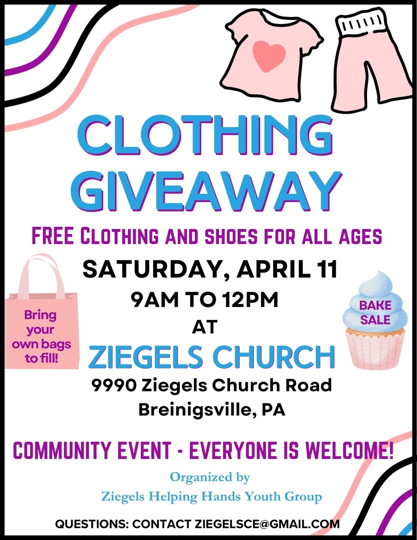 HomeEventsCommunity Clothing Give Away Community Clothing Give Away Saturday, April 11, 2026 9:00 AM - 12:00 PM 9:00 AM - 12:00 PM See all dates and Times 9990 Ziegels Church Rd Parking Deals Get a Ride LYFT UBER Add to Calendar 04/11/2026 09:00 AM 04/11/2026 12:00 PM America/Anguilla Community Clothing Give Away Bring a bag and fill with free clothing. There will also be a bake sale.Event LinksWebsite: https://go.evvnt.com/3510915-0 Details & Tickets: https://www.upcomingevents.com/allentown/events/9990-ziegels-church-rd/community-clothing-give-away-612264?ref=uceaddevent 9990 Ziegels Church Rd, 9990 Ziegels Church Road, Breinigsville, PA, 18031 Set Reminder Categories Fundraising & Charity, Neighborhood View Event Website » Bring a bag and fill with free clothing. There will also be a bake sale.Event LinksWebsite: https://go.evvnt.com/3510915-0