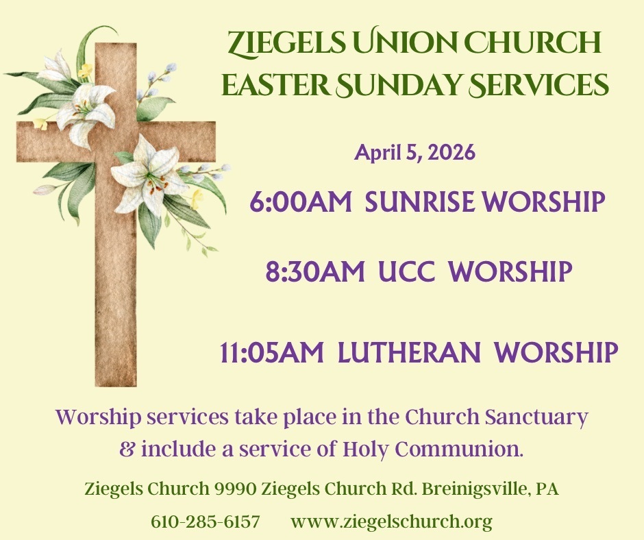 HomeEventsEaster Services Easter Services Sunday, April 05, 2026 6:00 AM - 12:00 PM 6:00 AM - 12:00 PM See all dates and Times 9990 Ziegels Church Rd Parking Deals Get a Ride LYFT UBER Add to Calendar 04/05/2026 06:00 AM 04/05/2026 12:00 PM America/Anguilla Easter Services Union Service at 6:00AM, UCC Service at 8:30 AM, Lutheran Service at 11:05 AM Communion offered at each serviceEvent LinksWebsite: https://go.evvnt.com/3510908-0 Details & Tickets: https://www.upcomingevents.com/allentown/events/9990-ziegels-church-rd/easter-services-612260?ref=uceaddevent 9990 Ziegels Church Rd, 9990 Ziegels Church Road, Breinigsville, PA, 18031 Set Reminder Categories Fundraising & Charity, Neighborhood View Event Website » Union Service at 6:00AM, UCC Service at 8:30 AM, Lutheran Service at 11:05 AM Communion offered at each serviceEvent LinksWebsite: https://go.evvnt.com/3510908-0 Read More View Less
