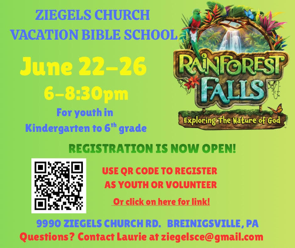 HomeEventsZIEGELS CHURCH VACATION BIBLE SCHOOL: RAINFOREST FALLS ZIEGELS CHURCH VACATION BIBLE SCHOOL: RAINFOREST FALLS Monday, June 22, 2026 6:00 PM - 8:30 PM 6:00 PM - 8:30 PM See all dates and Times 9990 Ziegels Church Rd Parking Deals Get a Ride LYFT UBER Add to Calendar 06/22/2026 06:00 PM 06/22/2026 08:30 PM America/Anguilla ZIEGELS CHURCH VACATION BIBLE SCHOOL: RAINFOREST FALLS Registration is now open! Use QR code to register as youth or volunteer. Or use the link: https://vbspro.events/p/befb06Event LinksWebsite: https://go.evvnt.com/3588414-0 Details & Tickets: https://www.upcomingevents.com/allentown/events/9990-ziegels-church-rd/ziegels-church-vacation-bible-school-rainforest-falls-641037?ref=uceaddevent 9990 Ziegels Church Rd, 9990 Ziegels Church Road, Breinigsville, PA, 18031 Set Reminder Categories Fundraising & Charity, Neighborhood View Event Website » Registration is now open! Use QR code to register as youth or volunteer. Or use the link: https://vbspro.events/p/befb06Event LinksWebsite: https://go.evvnt.com/3588414-0 Read More View Less