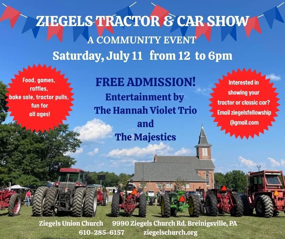 HomeEventsZIEGELS TRACTOR & CAR SHOW ZIEGELS TRACTOR & CAR SHOW Saturday, July 11, 2026 12:00 PM - 6:00 PM 12:00 PM - 6:00 PM See all dates and Times 9990 Ziegels Church Rd Parking Deals Get a Ride LYFT UBER Add to Calendar 07/11/2026 12:00 PM 07/11/2026 06:00 PM America/Anguilla ZIEGELS TRACTOR & CAR SHOW Ziegels Tractor & Car Show: Interested in showing your tractor or classic car? Email [email protected]. Come join us!Event LinksWebsite: https://go.evvnt.com/3587582-0 Details & Tickets: https://www.upcomingevents.com/allentown/events/9990-ziegels-church-rd/ziegels-tractor-car-show-639714?ref=uceaddevent 9990 Ziegels Church Rd, 9990 Ziegels Church Road, Breinigsville, PA, 18031 Set Reminder Categories Fundraising & Charity, Neighborhood View Event Website » Ziegels Tractor & Car Show: Interested in showing your tractor or classic car? Email [email protected]. Come join us!Event LinksWebsite: https://go.evvnt.com/3587582-0 Read More View Less