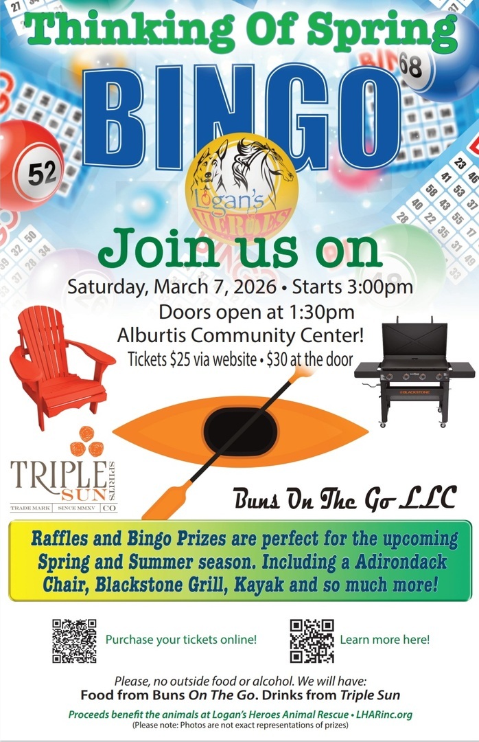 Come out for bingo to benefit Logan's Heroes Animal Rescue on Saturday, March 7, 2026 at Alburtis Community Center. Doors open at 1:30pm. Bingo starts at 3pm. $25 for tickets purchased at our link, $30 at the door. Plus raffles and special games available at the event. Prizes include Yeti merchandise, Yeti cooler, set of Adirondack chairs, Vera Bradley, Bogg bags, gift certificates, cornhole game set and much more.