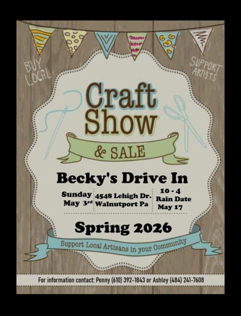 HomeEventsBecky's Drive In Spring Craft Show Becky's Drive In Spring Craft Show Sunday, May 03, 2026 10:00 AM - 4:00 PM 10:00 AM - 4:00 PM See all dates and Times Becky's Drive-In Parking Deals Get a Ride LYFT UBER Add to Calendar 05/03/2026 10:00 AM 05/03/2026 04:00 PM America/Anguilla Becky's Drive In Spring Craft Show Over 70 craft and direct sales vendors, tricky tray, refreshments. Vendor sign up still open! More info on facebook at Becky's Drive In Details & Tickets: https://www.upcomingevents.com/allentown/events/beckys-drive-in/beckys-drive-in-spring-craft-show-641918?ref=uceaddevent Becky's Drive-In, 4548 Lehigh Drive, Walnutport, PA, 18088 Set Reminder Categories Sales & Retail, Shopping Neighborhoods 8th Ward (Allentown)Trexler Park (Allentown)West End (Allentown)West End Theatre District (Allentown) Over 70 craft and direct sales vendors, tricky tray, refreshments. Vendor sign up still open! More info on facebook at Becky's Drive In