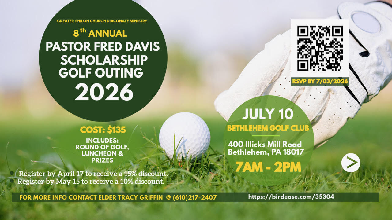 Enjoy a day of golf, community, and impact at the 8th Annual Pastor Fred Davis Scholarship Golf Outing. Help us raise funds to support graduating seniors pursuing higher education.