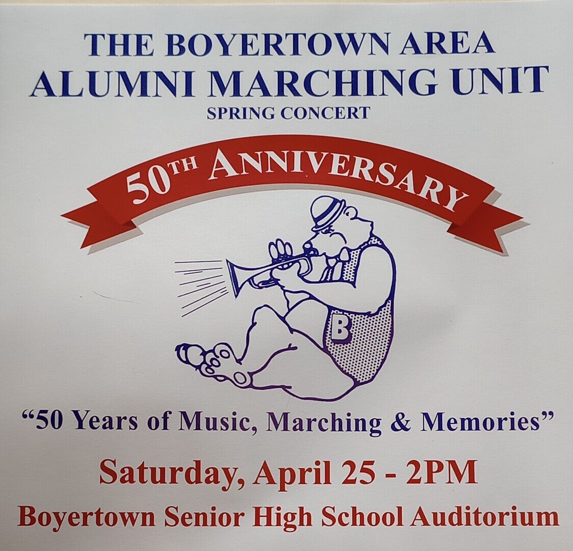 Celebrate 50 years of "Music, Marching and Memories" with the Boyertown Alumni Marching Unit at its 50th Anniversary Spring Concert, featuring guest conductor Travis J. Weller. Musical selections played in the early years of the Marching Unit will include "MacArthur Park" "Man of La Mancha" and "Official West Point March". The Band front of twirlers, rifles and flags will perform to "St. Louis Blues March", "Theme from 'Star Trek Generations" and Arlen R. Saylor's "United Services Medley". Dr. Weller - a popular composer, clinician and professor at Messiah College - will direct three of his compositions: "The Wellerman Come", "American Visions" and the world premiere of a piece commissioned by the Marching Unit for the event, "Golden Festival Overture."