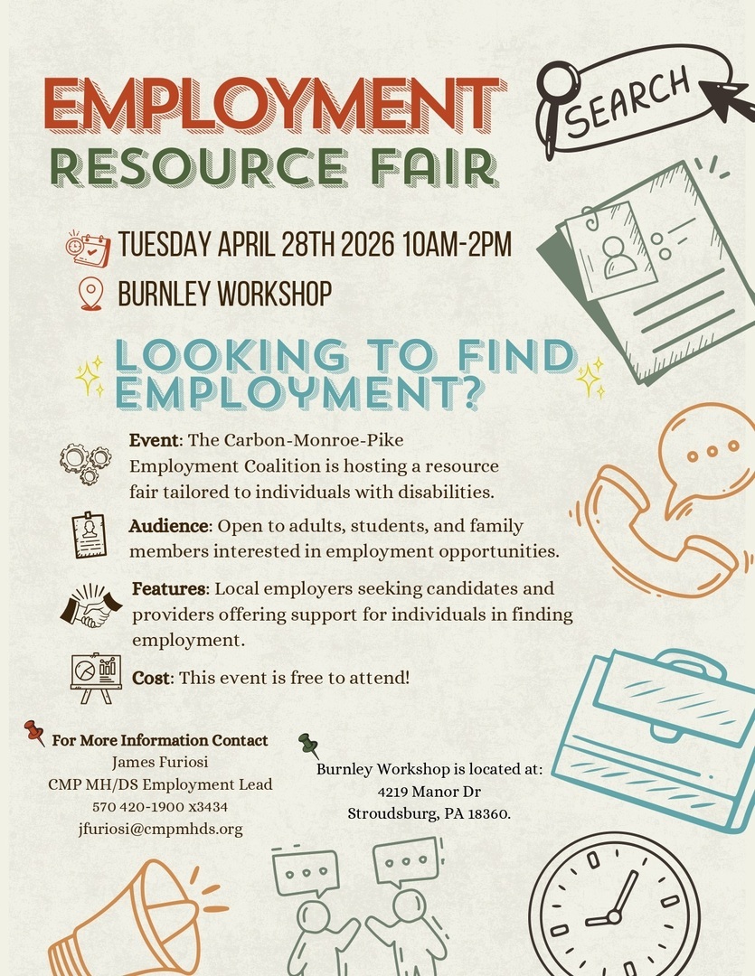 HomeEventsEmployment Resource Fair for People with Disabilities Employment Resource Fair for People with Disabilities Tuesday, April 28, 2026 10:00 AM - 2:00 PM 10:00 AM - 2:00 PM See all dates and Times Burnley Employment & Rehab Services Parking Deals Get a Ride LYFT UBER Add to Calendar 04/28/2026 10:00 AM 04/28/2026 02:00 PM America/Atikokan Employment Resource Fair for People with Disabilities Fair will have Office of Vocational Rehabilitation, job coaching providers, local colleges, PA Able, Careerlink, Youth Employment Services, advocacy groups, employers, and more. Details & Tickets: https://www.upcomingevents.com/allentown/events/burnley-employment-rehab-services/employment-resource-fair-for-people-with-disabilities-601427?ref=uceaddevent Burnley Employment & Rehab Services, 4219 Manor Drive, Stroudsburg, PA, 18360 Set Reminder Categories Business & Networking, Business-Related, Job Fair Neighborhoods College Hill (Easton)Eastlawn Gardens (Nazareth)Upper Nazareth Township (Nazareth)West Ward (Easton) Fair will have Office of Vocational Rehabilitation, job coaching providers, local colleges, PA Able, Careerlink, Youth Employment Services, advocacy groups, employers, and more.