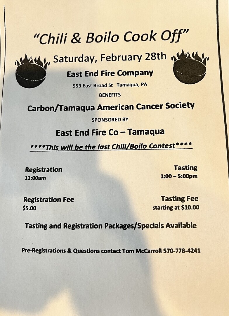 Benefits Carbon/Tamaqua American Cancer Society ** This will be the last Chili/Boilo Contest**