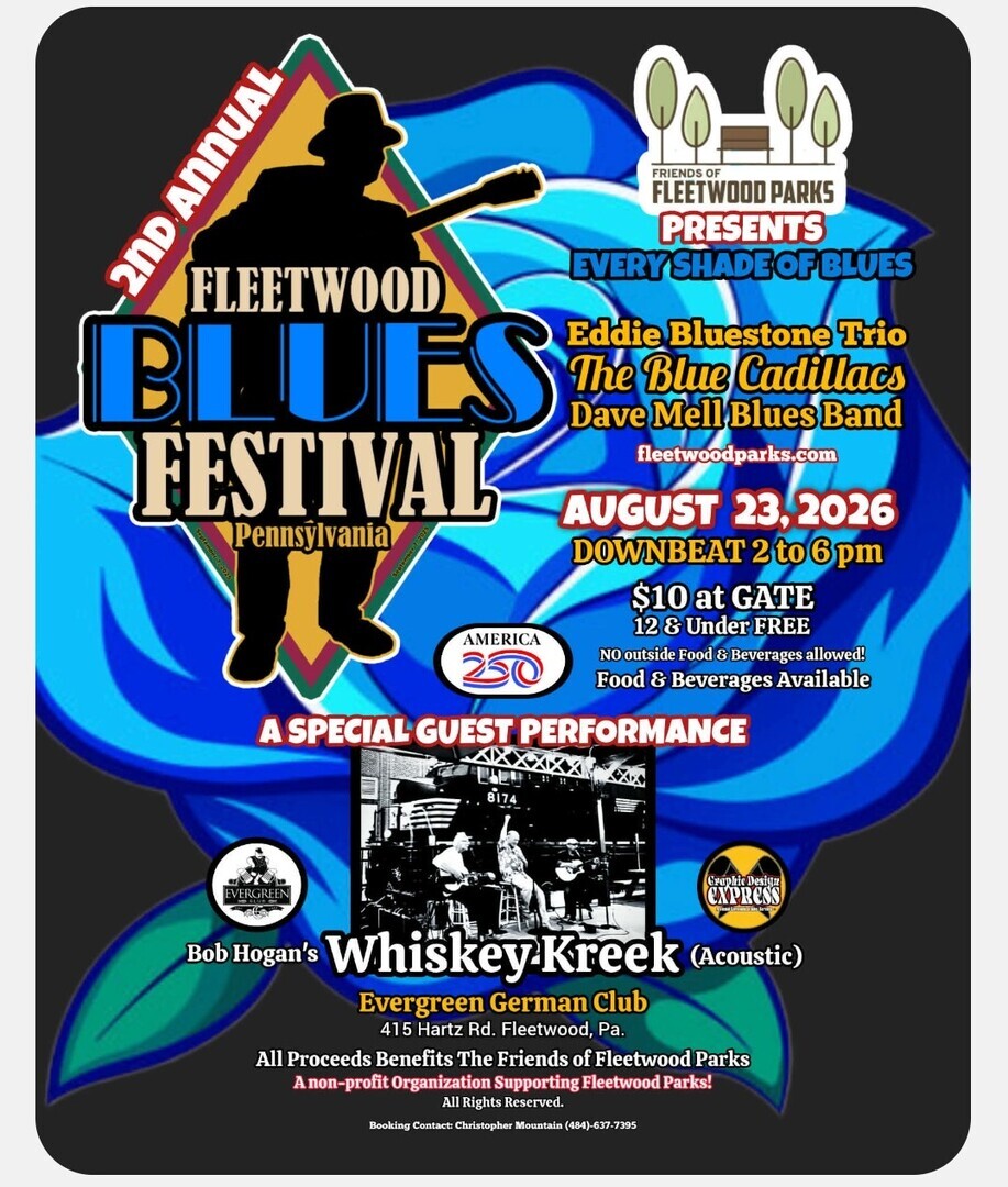 HomeEventsFleetwood Blues Festival of Pennsylvania Fleetwood Blues Festival of Pennsylvania Sunday, August 23, 2026 2:00 PM - 6:00 PM 2:00 PM - 6:00 PM See all dates and Times Evergreen German Club Parking Deals Get a Ride LYFT UBER Add to Calendar 08/23/2026 02:00 PM 08/23/2026 06:00 PM America/Anguilla Fleetwood Blues Festival of Pennsylvania Featuring Eddy Bluestone Trio, The Dave Mell Blues Band, The Blue Caddilacs and Whiskey Kreek. Details & Tickets: https://www.upcomingevents.com/allentown/events/evergreen-german-club-/fleetwood-blues-festival-of-pennsylvania-621685?ref=uceaddevent Evergreen German Club , 15 Hartz Road, Fleetwood, PA, 19522 Set Reminder Categories Indoor / Outdoor Event, Live Entertainment, Live Performance, Performing Arts Featuring Eddy Bluestone Trio, The Dave Mell Blues Band, The Blue Caddilacs and Whiskey Kreek.