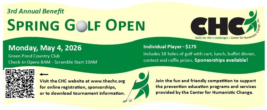 Join the fun and friendly competition for a worthy cause at the 3rd Annual Spring Golf Open, benefiting the Center for Humanistic Change’s programs and services. The tournament will be held at Green Pond Country Club on May 4, 2026. It includes 18 holes of golf with a cart, a light lunch, a hot buffet dinner with beverages, contest prizes, and a premium raffle. The cost is $175 per player. You can register online, or if you prefer to mail in your registration with a check. Commitments are due by April 15, 2026. Our address 3400 Bath Pike, Suite 306. Bethlehem PA 18017.