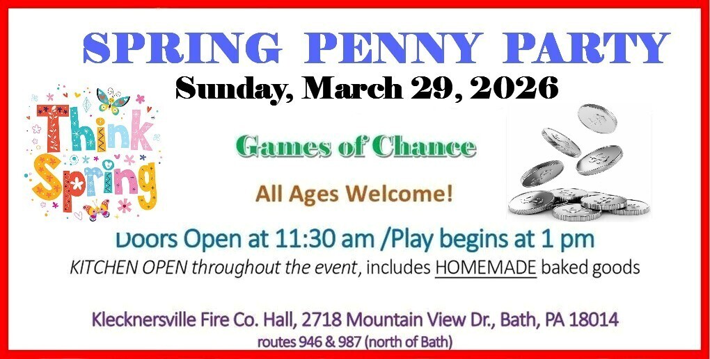The Moore Township Lioness-Lions Club will be hosting their semi-annual penny party, Sunday March 29, 2026, at the Klecknersville Rangers Fire Company Hall (2718 Mountain View Dr., Bath, PA 18014; Routes 946 and 987, just north of Bath). All ages welcome to enjoy a fun-filled afternoon with games of chance, tasty food and fellowship. Homemade food, including homemade baked goods, and drinks can be purchased starting at 11:30 am and throughout the afternoon. You can bring your own pennies or purchase them along with game tickets which include a free ticket for door prizes. There will be raffle tickets for a huge Easter Dinner basket and tickets for tricky tray items. Doors open at 11:30 a.m. with the Penny Party starting at 1:00 p.m.