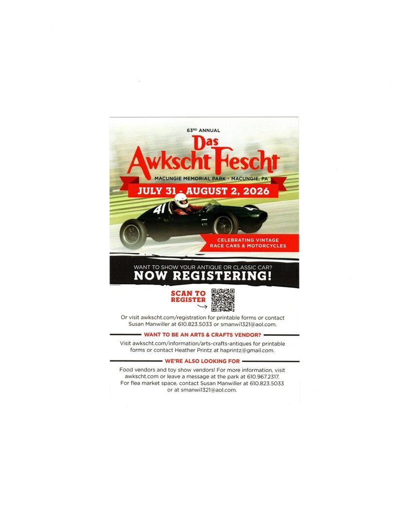 Join us for a three-day car show, flea market, car corral and Toy Town in beautiful, shady park. This year's feature is race cars and antique motorcycles. We have arts and crafts, including quilts in air-conditioned building, live bands on stage and square dance shows. There will be children's activities and petting zoo, food and beer garden. Admission includes all events, shows, and entertainment. Go to www.awkscht.com or call 610-967-2317 for information.