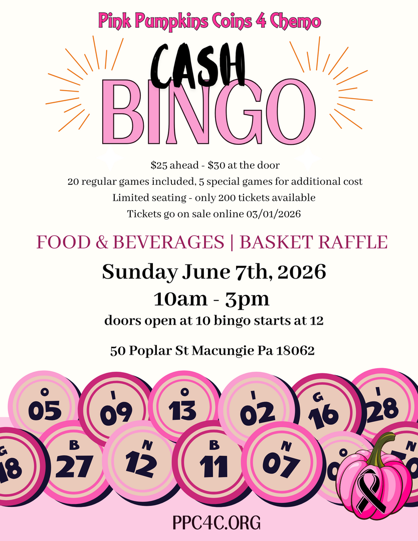 The doors will open at 10:00am with Bingo starting at 12:00pm. Advanced tickets for this event can be purchased online at PPC4C.org for $25.00, or $30.00 at the door, which includes 20 games of Bingo. There will also be 5 special games and a 50/50 that can be purchased. Other festivities include a basket raffle. Food and beverages will be available for purchase.