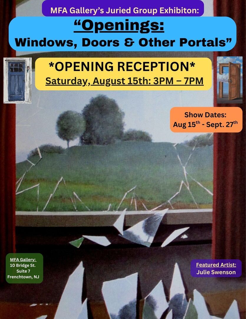 Join MFA Gallery on Saturday, August 15th from 3pm – 7pm, for the Opening Reception of our Juried Group Exhibition entitled “Openings: Windows, Doors & other Portals”!