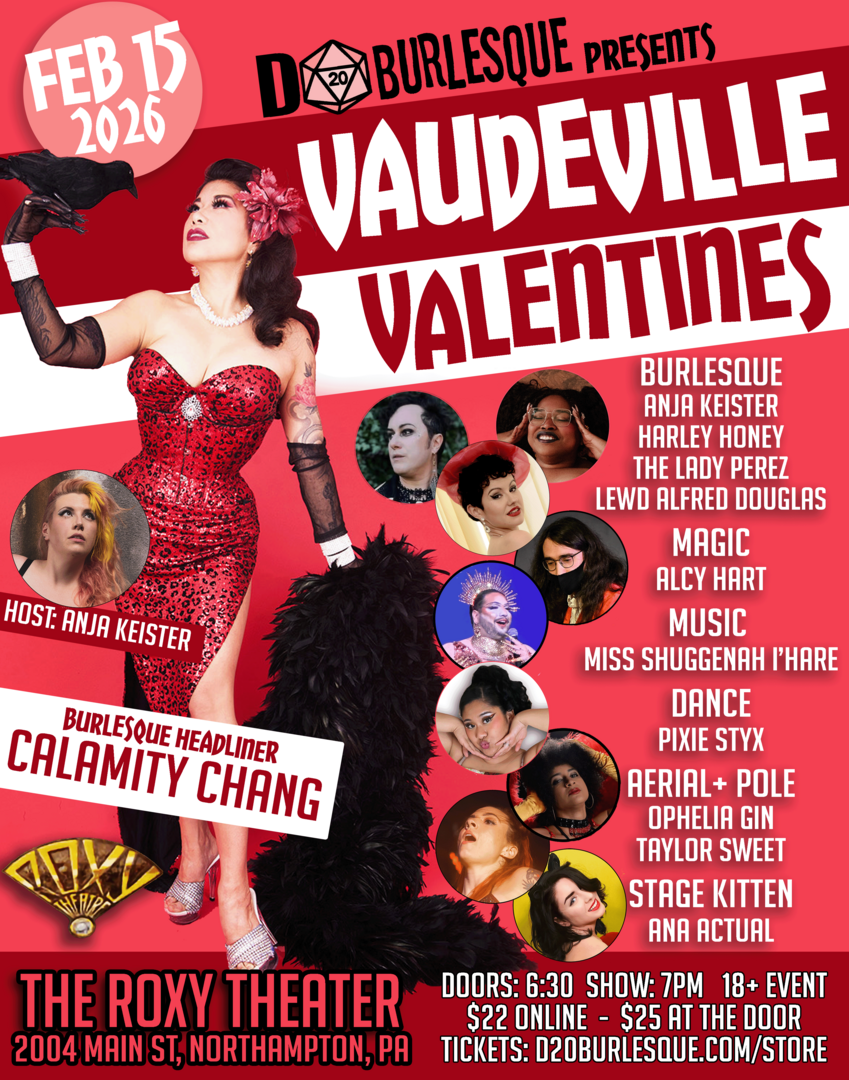 Join D20 Burlesque as their founder, Anja Keister brings her NYC founded show to her hometown of Northampton, PA for the first time ever. Come celebrate Valentine’s Day with a variety of performances that will have your heart racing. Expect not only burlesque, but dance, magic, and pole performances as well.