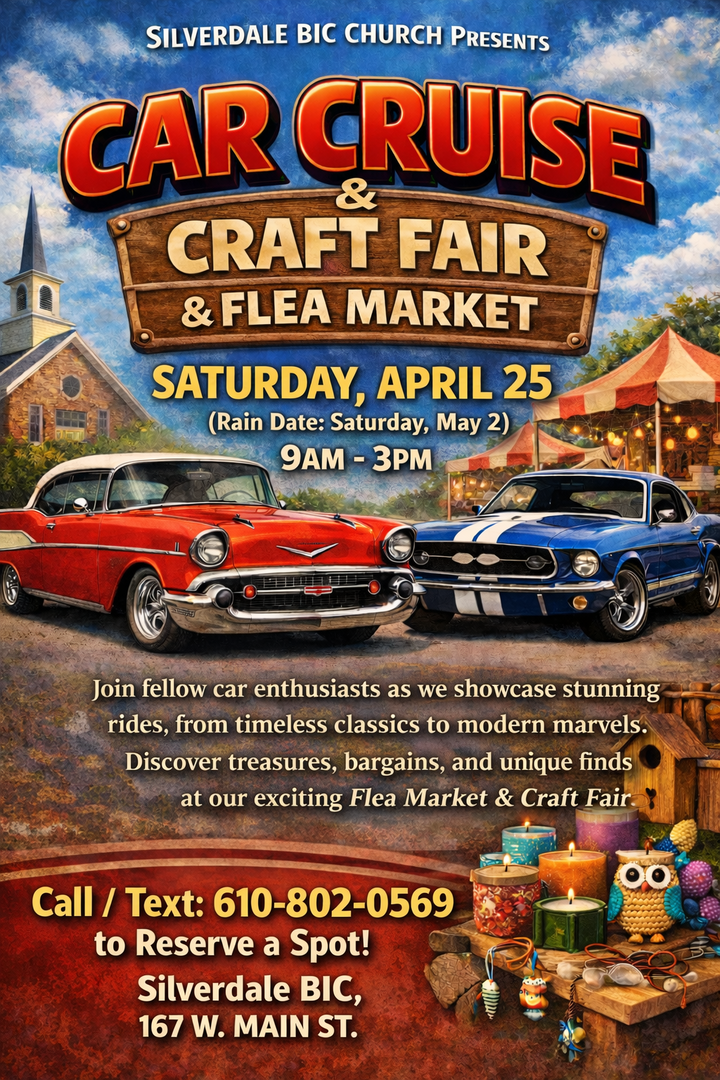 We’re excited to host our Car Cruise, Craft Fair, & Flea Market on Saturday, April 25 from 9 AM–3 PM (Rain Date: May 2)!