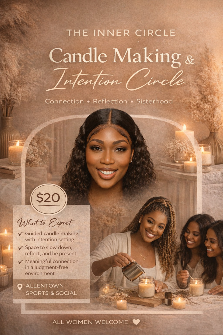 The Inner Circle Invites You to An Intentional Evening Created for Women Who Are Seeking Connection, Calm, And Community. This Is More Than a Candle-Making Class. It Is a Safe, Welcoming Space Designed for Women to Slow Down, Reflect, And Reconnect with Themselves and With One Another. During This Guided Experience, You’ll Create Your Own Candle While Setting Personal Intentions in a Supportive, Judgment-Free Environment. There Is No Pressure to Share, Perform, Or Have Everything Figured Out. This Space Honors Where You Are.