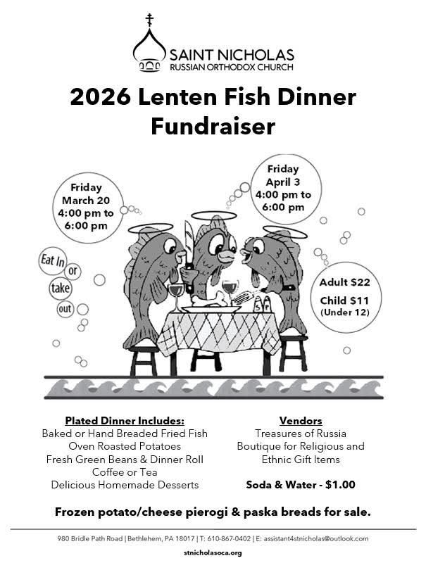 In addition to the meal, there will be vendors offering religious items and unique ethnic gifts, as well as frozen potato and cheese pierogi and traditional paska breads available for purchase.